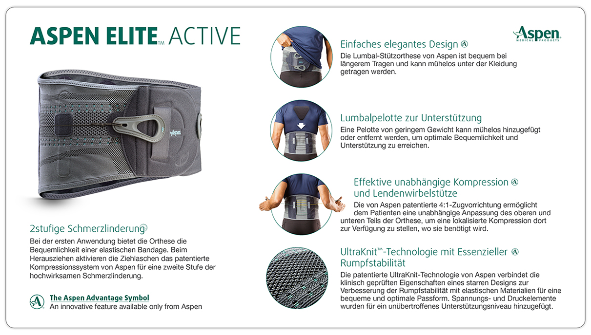 Die Aspen Elite Active enthält die notwendigen Komponenten, die erforderlich sind, um den Becken- und Lendenbereich zu stabilisieren, und bietet dabei die Fähigkeit, die Orthese, durch den modularen Aufbau, in ihrem Wirkungsgrad gezielt und flexibel zu verringern, um sie an die individuellen Patientenbedürfnisse und den Heilungsverlauf anzupassen. Die einzigartige Kombination der patentierten UltraKnit™-Technologie und des patentierten unabhängigen Kompressionsystems von Aspen bietet essentielle Stabilität der LWS zur Hilfe bei der Wiederherstellung der funktionellen Mobilität, wodurch eine effektive Linderung von Rückenschmerzen im Lendenbereich, sowie eine optimale Stabilisierung, bei gleichzeitiger größtmöglicher Flexibilität durch den modularen Aufbau (der Wirkungsgrad kann in Abhängigkeit vom Heilungsverlauf und den individuellen Bedürfnissen flexibel angepaßt werden) der Aspen Elite Active sichergestellt wird.uell mittels Spanngurte eingestellt werden. Das führt zu einer aufrechteren Oberkörperposition und damit zu einer spürbaren Entlastung der Wirbelsäule. Die Kompression entlang der Lendenwirbelsäule verbessert die Propriozeption und unterstützt eine hebe- und trageoptimierte Körperhaltung.Pflege