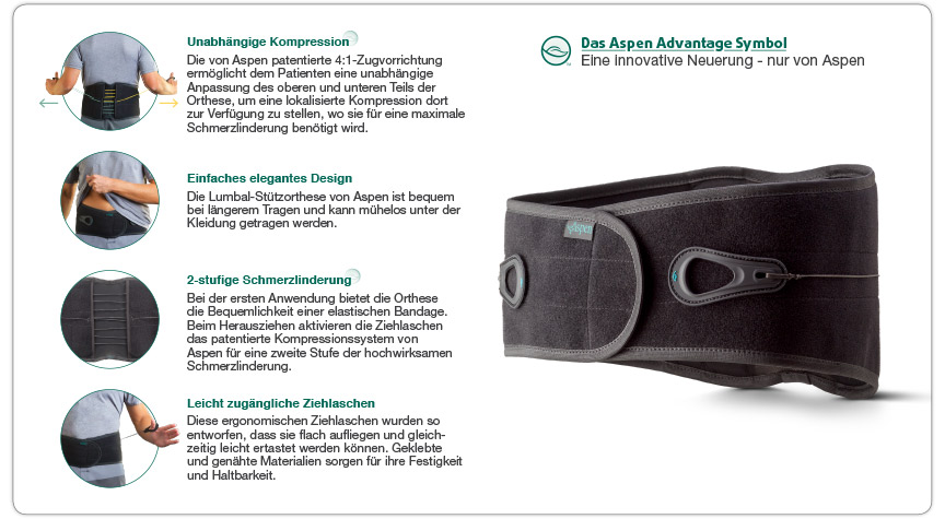 Die Lumbal-Stützorthese von Aspen bietet ein einzigartiges Schmerzlinderungssystem, das die wesentlichen Elemente in sich vereinigt, die für eine verbesserte Leistungsfähigkeit erforderlich sind. Das einfache flache Design bietet durch das patentierte Kompressionssystem von Aspen eine effektive Linderung von Rückenschmerzen im Lendenbereich für den aktiven Patienten.